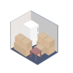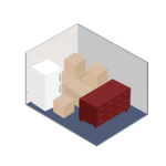 It fits furnishings of a mid-sized bedroom, including a queen-sized bed, a dresser, a TV and several small to medium-sized boxes.